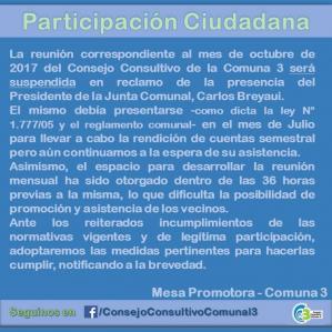 Los vecinos que integran el Consejo Consultivo Comunal 3 (Balvanera y San Crist贸bal) hab铆an suspendido la asamblea de octubre ante la ausencia de Breyaui, que estaba pautada para el jueves 12 en el Normal 9 (Callao y Corrientes). La Mesa Promotora emiti贸 un comunicado que ped铆a "la leg铆tima participaci贸n, cumplimiento de las normativas y rendici贸n de cuentas". En el comunicado la Mesa dijo que cancel贸 el encuentro "en reclamo de la presencia" de Breyaui: "El mismo deb铆a presentarse, como dicta la ley 1.777 (de Comunas) y el reglamento comunal, en el mes de julio para llevar a cabo la rendici贸n de cuentas semestral, pero a煤n continuamos a la espera de su asistencia".
