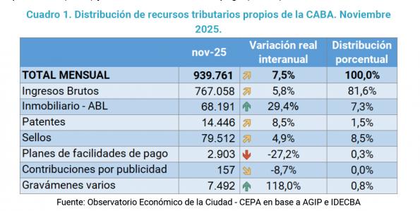 En noviembre de 2025, la recaudación propia de la Ciudad alcanzó casi 939 mil millones de pesos, lo que representa un incremento real interanual del 7,5%. El tributo más relevante continúa siendo Ingresos Brutos, que explica el 81,6% del total y aportó 767 mil millones de pesos. Este impuesto registró un aumento real del 5,8% respecto del mismo mes del año anterior, aunque mostró una leve caída mensual del 0,24%, lo que sugiere una estabilización en niveles inferiores a los históricos.