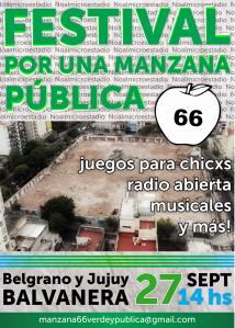 El s谩bado 27 desde las 14 se realiz贸 sobre Avenida Belgrano, a metros de Jujuy, un festival en reclamo de la recuperaci贸n como espacio p煤blico de la manzana all铆 demolida. Los vecinos se oponen a la iniciativa privada de construir en el lugar un auditorio para espect谩culos musicales. Buenos Aires, 29 de setiembre de 2014. Cosas de la vida, se hizo famosa en el Once la Manzana 66. De nomenclatura catastral pas贸 a identificar un escenario de visiones contrapuestas sobre el futuro del barrio.