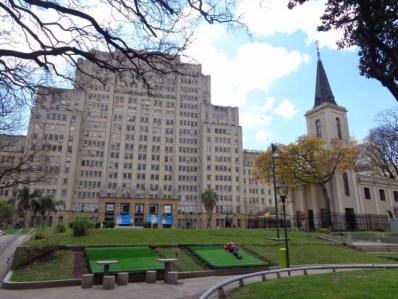 En los años 70 la manzana de la actual Plaza Houssay comprendida por la avenida Córdoba y las calles Paraguay, Junín y Uriburu frente a las facultades de Medicina y Ciencias Económicas, albergaba el edificio del viejo Hospital de Clínicas que a partir de 1973 fue una de las sedes de la Facultad de Filosofía y Letras de la UBA. La dictadura del 76 barrió con él, dejó en pie sólo la capilla y construyó un estacionamiento subterráneo. Buenos Aires, 14 de junio de 2016. Tanta destrucción significó la tala de innumerable cantidad de árboles centenarios y el desparramo de cemento en desniveles para dificultar las manifestaciones universitarias donde antes había bellísimos parques.