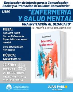 En la Legislatura declararon de interés un libro sobre enfermería y salud mental, titulado “Enfermería y Salud Mental: Una invitación al Desacato”, de la escritora María Lucrecia Ciriani. Se trata de un texto que permite reflexionar sobre las praxis de salud mental, pero fundamentalmente, sobre las prácticas sanitarias burocratizadas, buscando transformar el campo de la enfermería en general y de la salud mental. Buenos Aires, 29 de octubre de 2024. El viernes por la tarde, la Legislatura porteña distinguió el libro “Enfermería y Salud Mental: Una invitación al Desacato” de la escritora María Lucrecia Ciriani, publicado por la editorial Lugar, declarándolo de Interés para la Promoción de la Salud. El evento se celebró en el Salón Presidente Alfonsín, en el que estuvieron presentes el diputado y autor del proyecto, Juan Pablo O’Dezaille; Luciana Luna, Licenciada en Enfermería y Especialista en Salud Mental; Luis Bruschtein, periodista y la autora del libro.