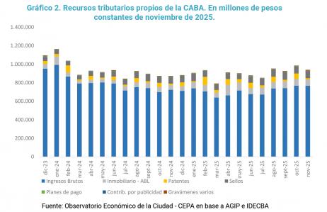 En noviembre de 2025, la recaudación propia de la Ciudad alcanzó casi 939 mil millones de pesos, lo que representa un incremento real interanual del 7,5%. El tributo más relevante continúa siendo Ingresos Brutos, que explica el 81,6% del total y aportó 767 mil millones de pesos. Este impuesto registró un aumento real del 5,8% respecto del mismo mes del año anterior, aunque mostró una leve caída mensual del 0,24%, lo que sugiere una estabilización en niveles inferiores a los históricos.